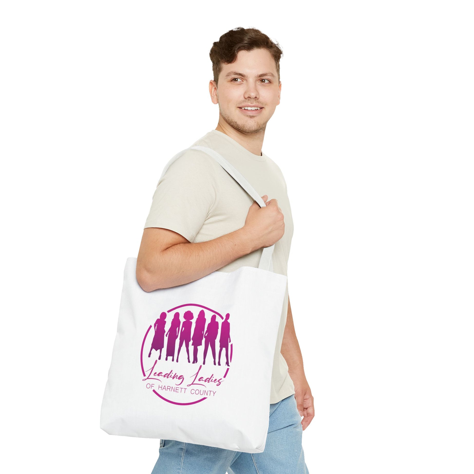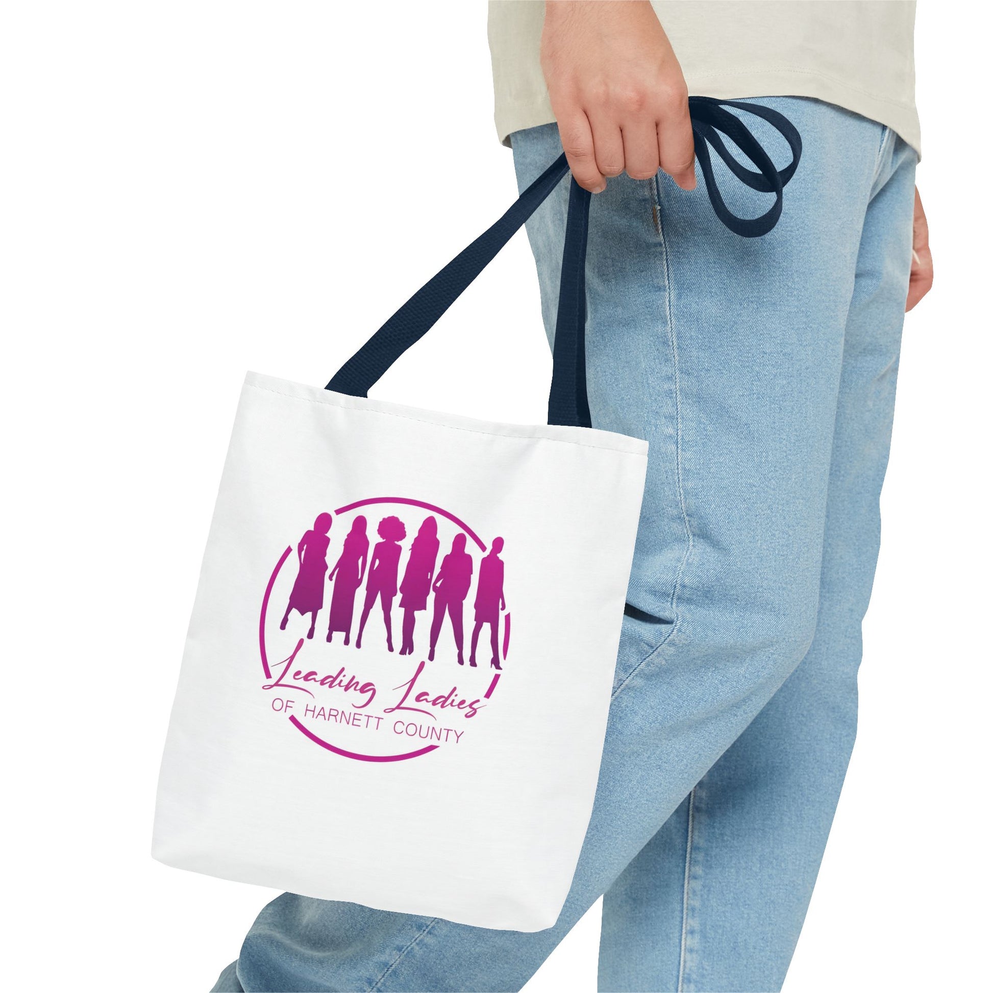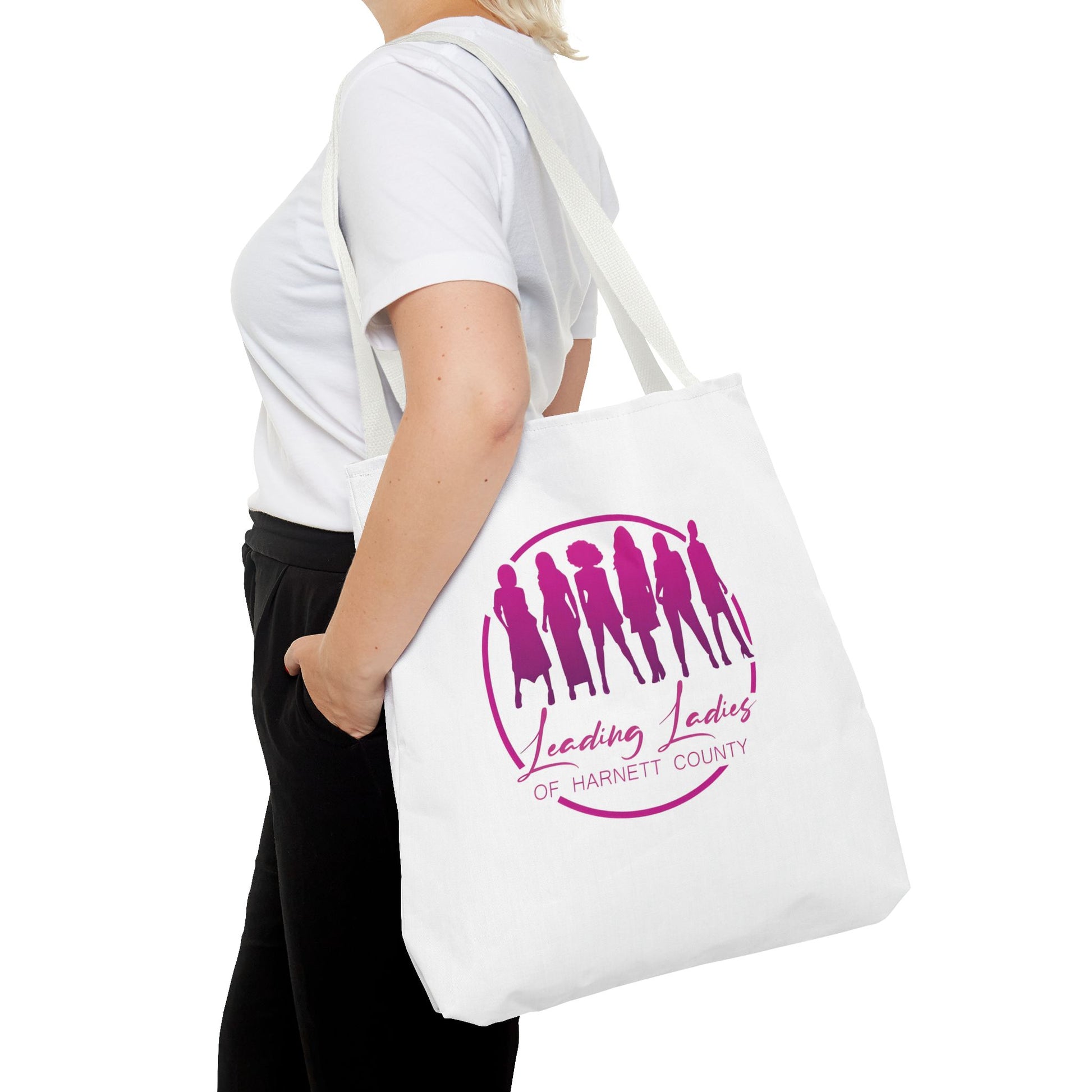 Introducing our exclusive tote bag for the Leading Ladies of Harnett County, a vibrant women's organization dedicated to service, community, and sisterhood! This stylish tote symbolizes the energy, unity, and bold spirit of this great empowered women. Perfect for carrying essentials to meetings, community events, or everyday errands. This tote serves as a statement of pride and commitment to uplifting each other and the community. Celebrate the strength and camaraderie of the Leading Ladies with this chic and meaningful accessory, designed to inspire and unite.