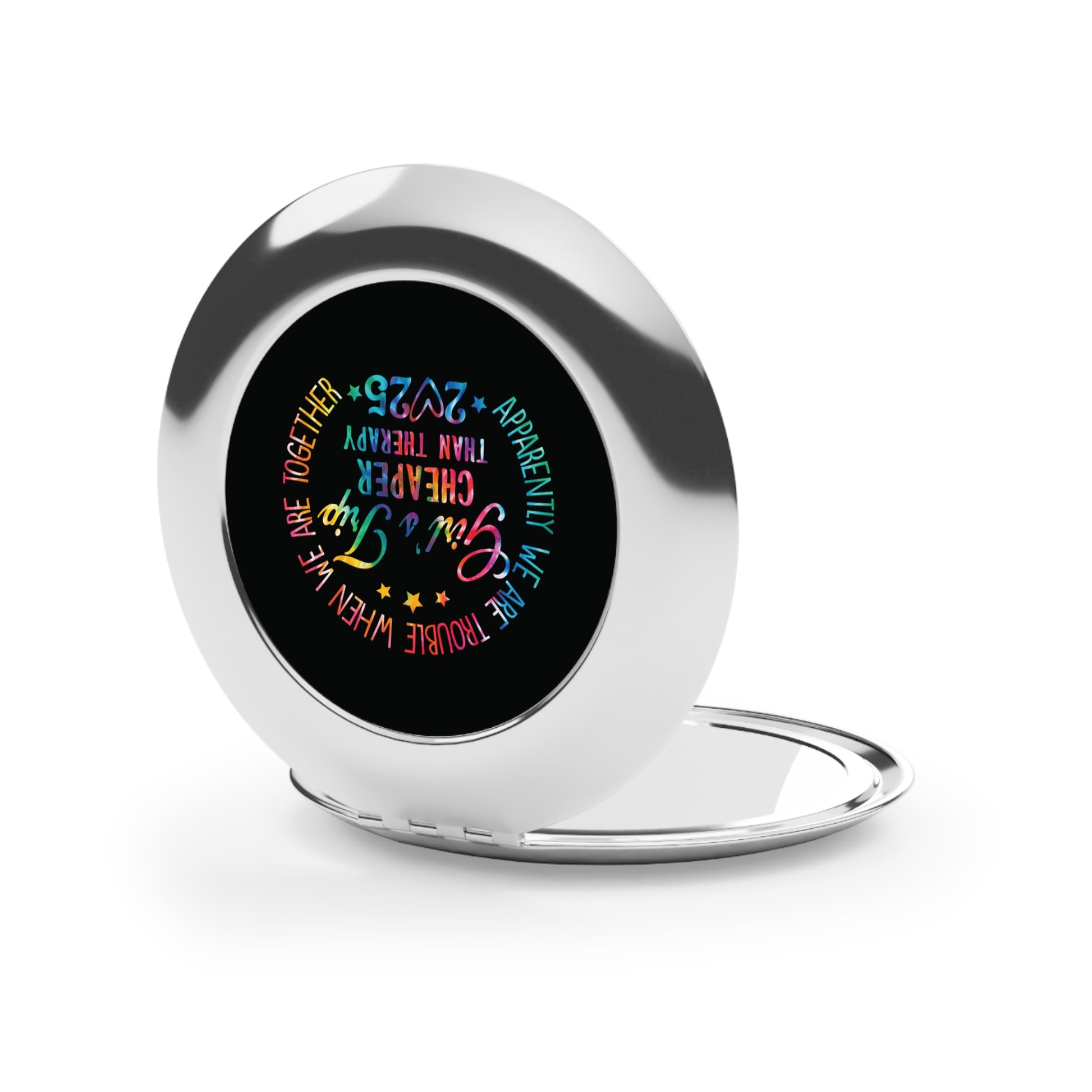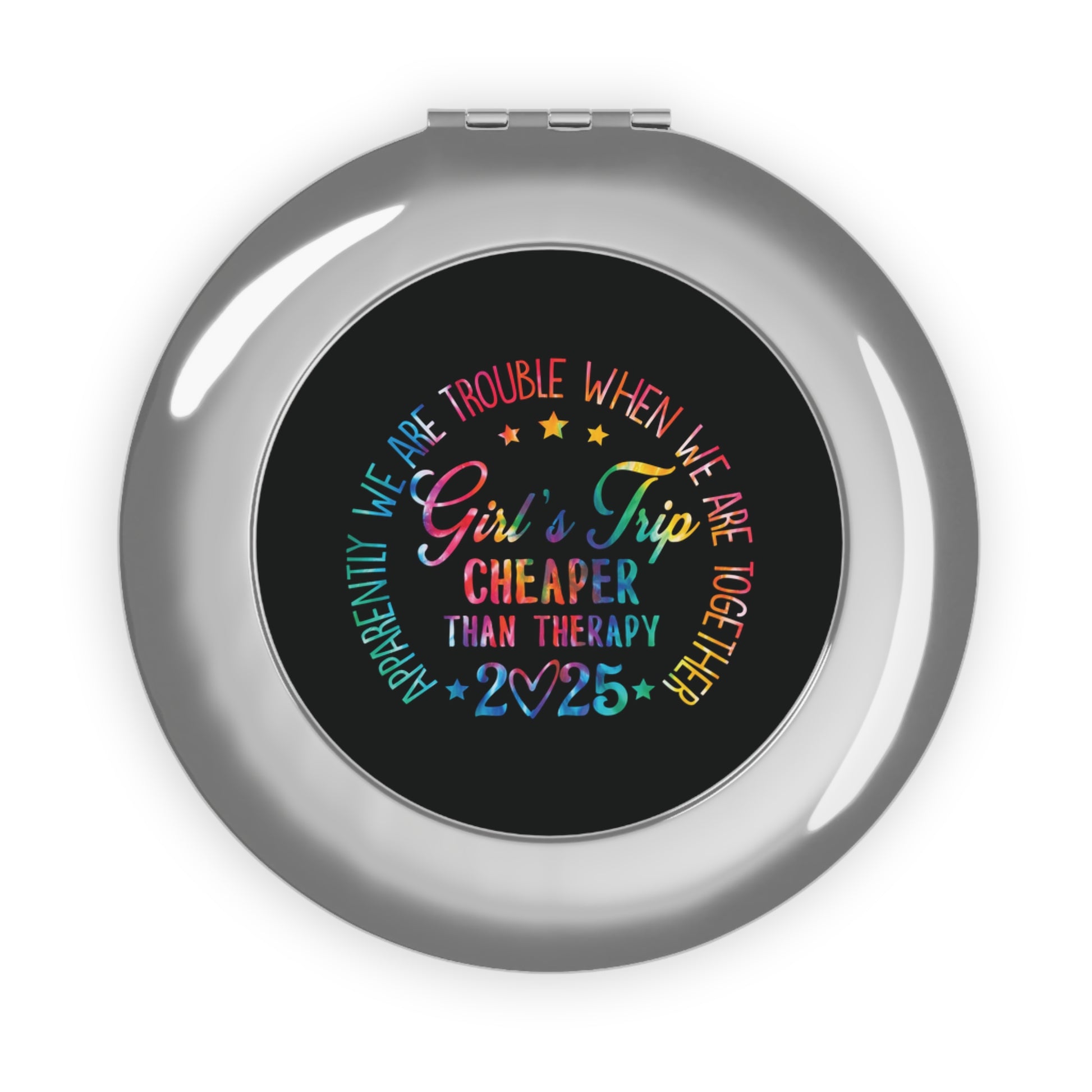 Get ready to reflect your best self on every girls' trip! The "Girls Trip: Cheaper Than Therapy" compact mirror is the ultimate travel essential for young ladies and women hitting the road with their crew. Whether you're touching up your makeup before brunch, snapping selfies at the beach, or just making sure you're selfie-ready for every adventure, this sleek mirror has you covered!